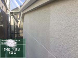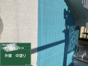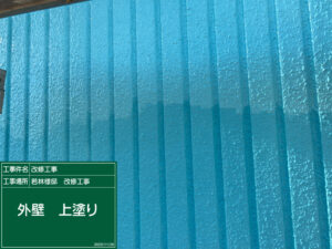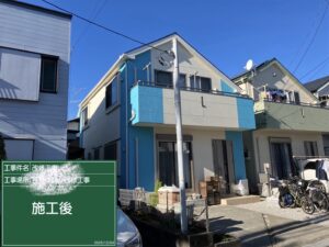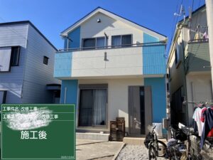 外壁も屋根も耐久性の高いフッ素塗料での仕様です。水色が映えてガラッとイメチェンしました。塗装前はALC目地のひび割れが多数発生しており、雨水の侵入の心配がありましたが、しっかりとコーキング処理し下塗りを2回塗りする事で塗膜の厚い仕上がりとなり、防水性も抜群です。
